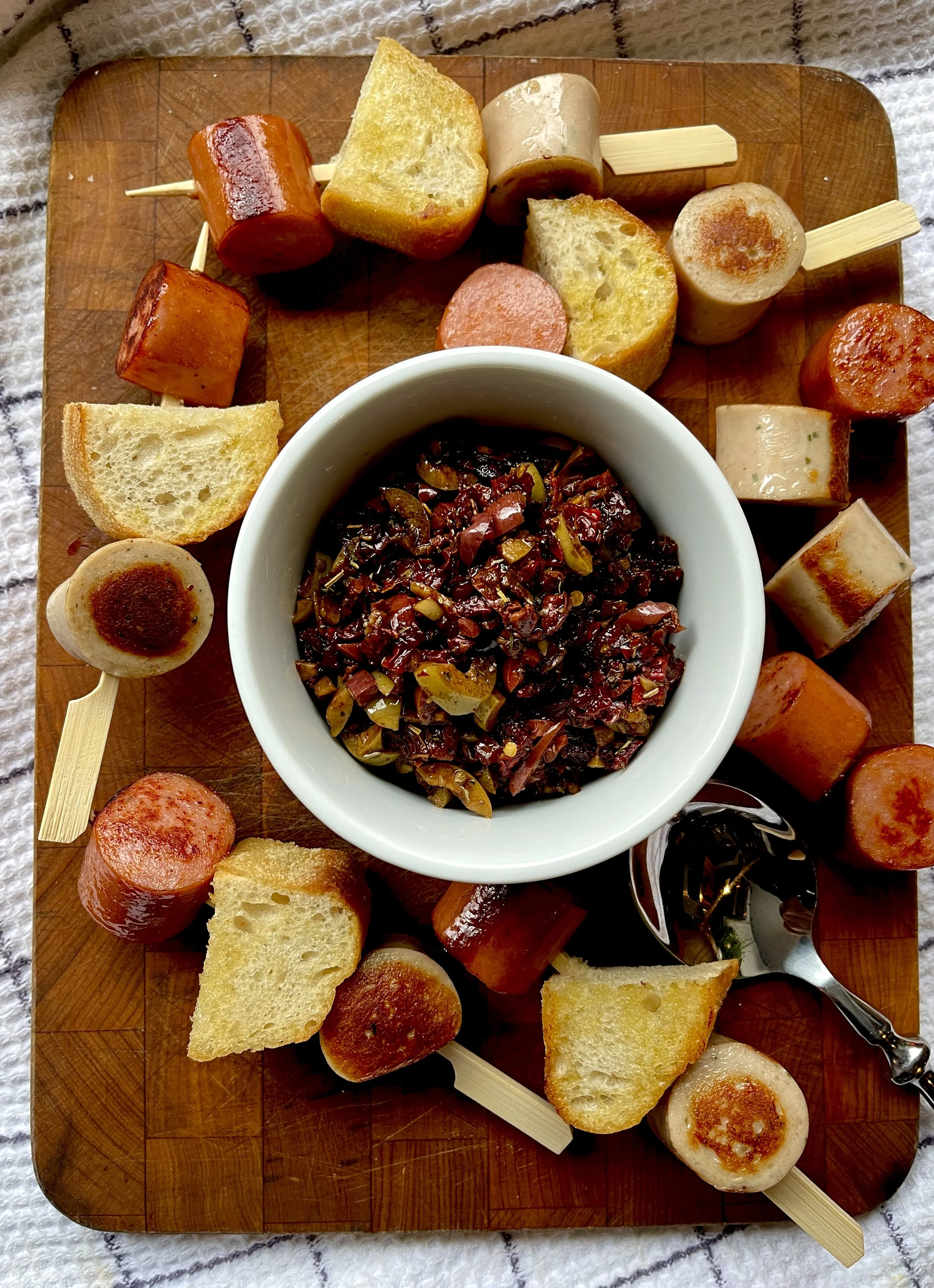 —Assemble the skewers and cut up extra bread for even more dipping